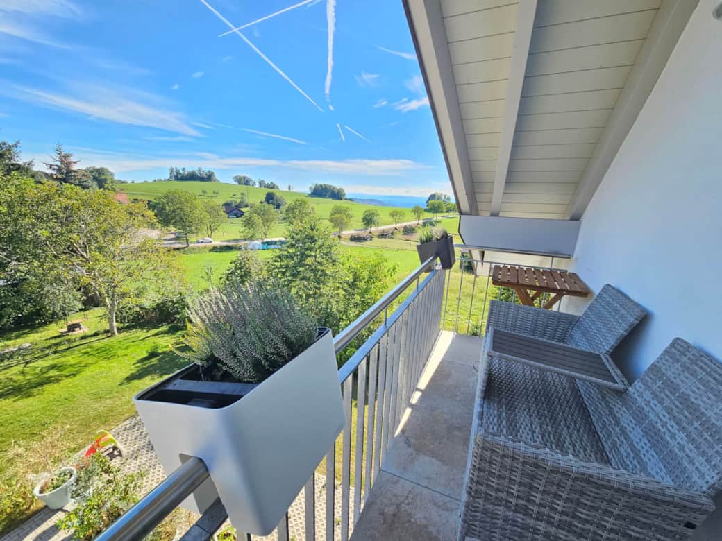 Vom Balkon aus schweift der Blick über das Wiesental bis nach Basel und ins Umland. Die ruhige Lage macht die Wohnung zum perfekten Rückzugsort – gleichzeitig sind Ausflüge, Wanderungen und Aktivitäten in der Region schnell erreichbar.